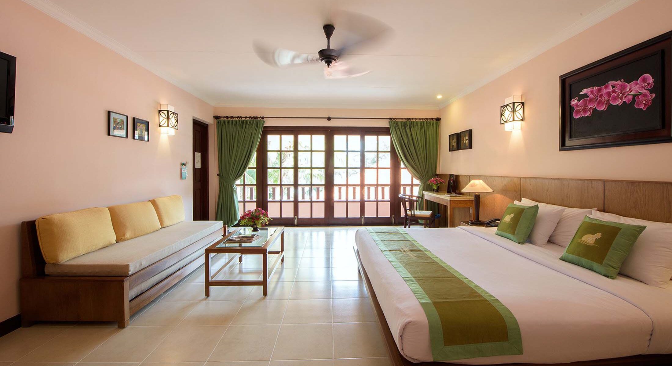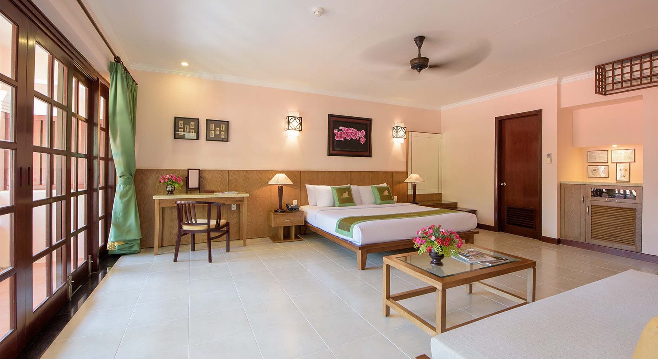 Phòng Studio nằm gần bãi biển, mang đến không gian thoáng đãng và tiện nghi để bạn thư giãn. Khu vực sinh hoạt rộng rãi kết nối trực tiếp với ban công riêng, mở ra tầm nhìn xanh mát của khu vườn. Giường Queen êm ái cùng thiết kế tinh tế tạo nên nơi nghỉ dưỡng lý tưởng, giúp bạn tận hưởng sự thoải mái và những khoảnh khắc yên bình bên người thân sau một ngày khám phá.